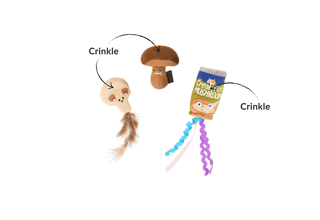 - Trio includes two feather-topped mushrooms and a plush cream of mushroom can with curly strings for batting, swatting and wrestling fun