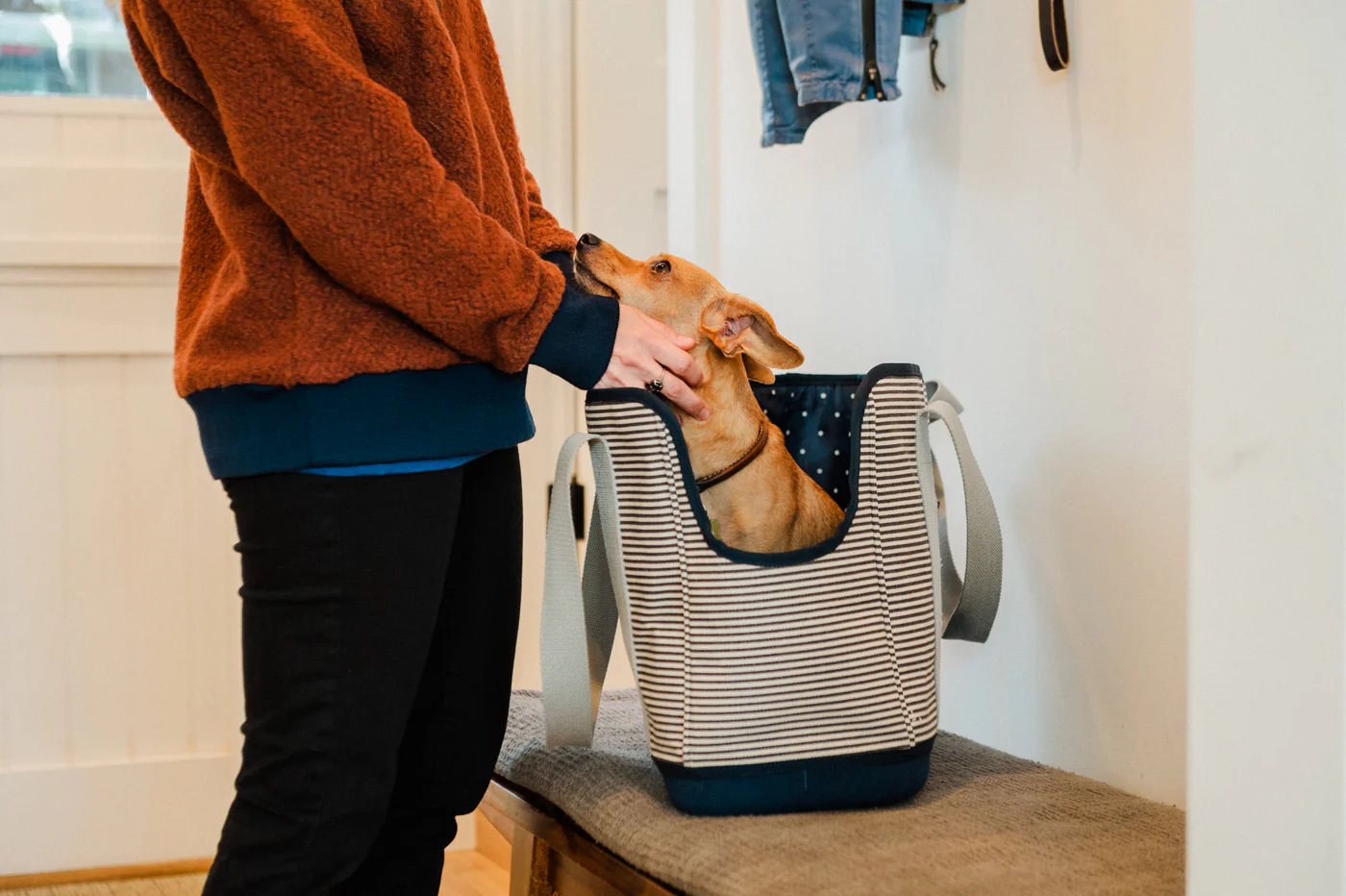 This LeftPine x P.L.A.Y. easy-carrying shoulder bag is a cute and classic lightweight option to take your furry friend with you on the go. The sweet navy and white dot nylon interior is perfect for easy cleaning and provides extra comfort with its removable and washable padded base. Don’t furget to pack your pup’s favorite essentials in the exterior drop pocket for easy reach.